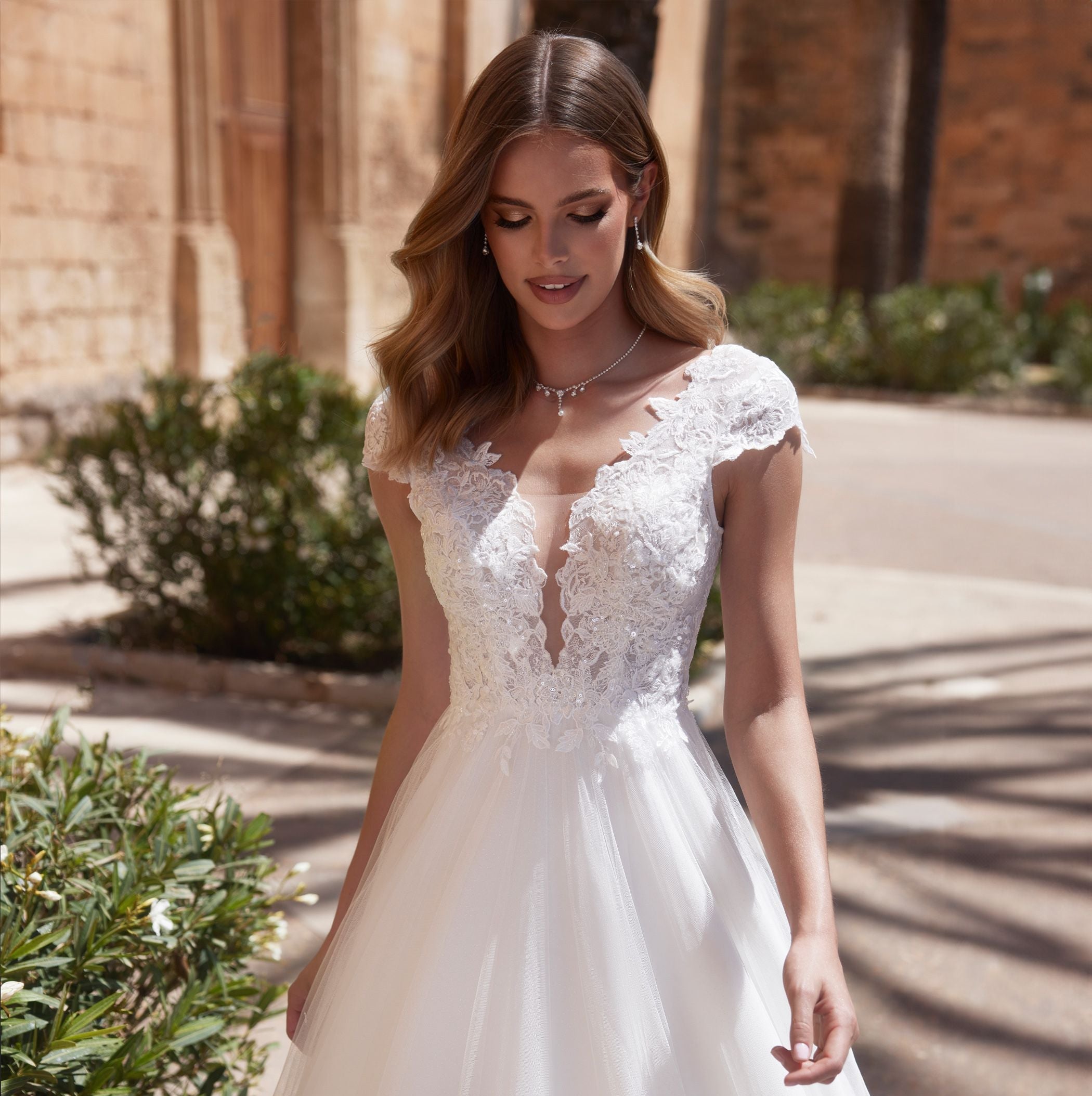 Uriel is our romantic ball gown crafted from lace and tulle. This stunning gown features a beautiful cathedral train and a sophisticated V-back.