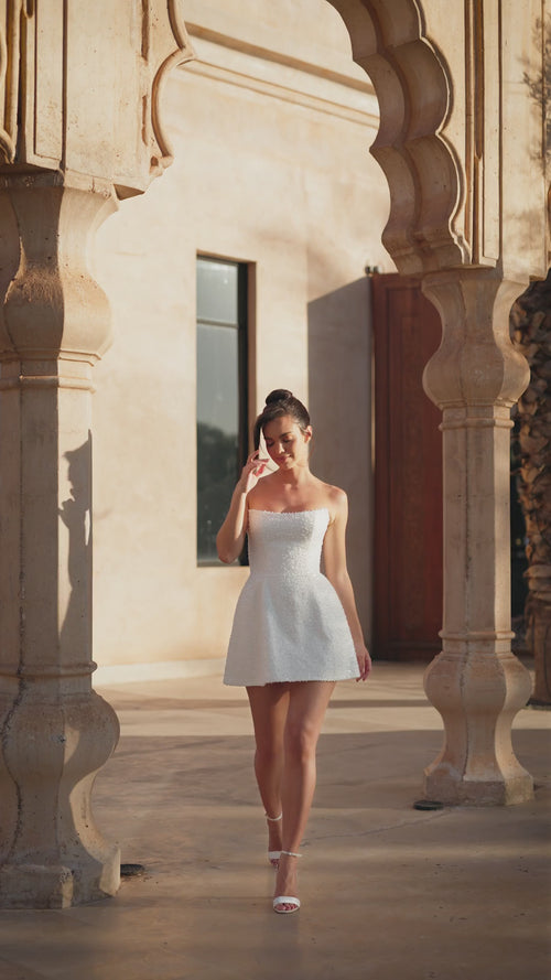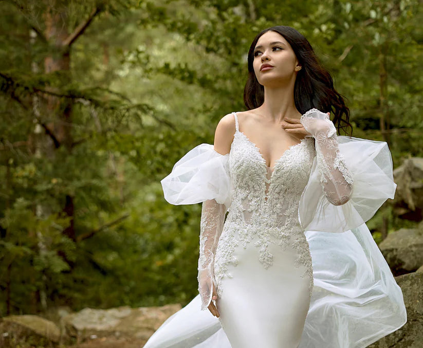 The ESTELLE two-in-one mermaid-style dress features detachable long sleeves and can also be worn with the matching cape.