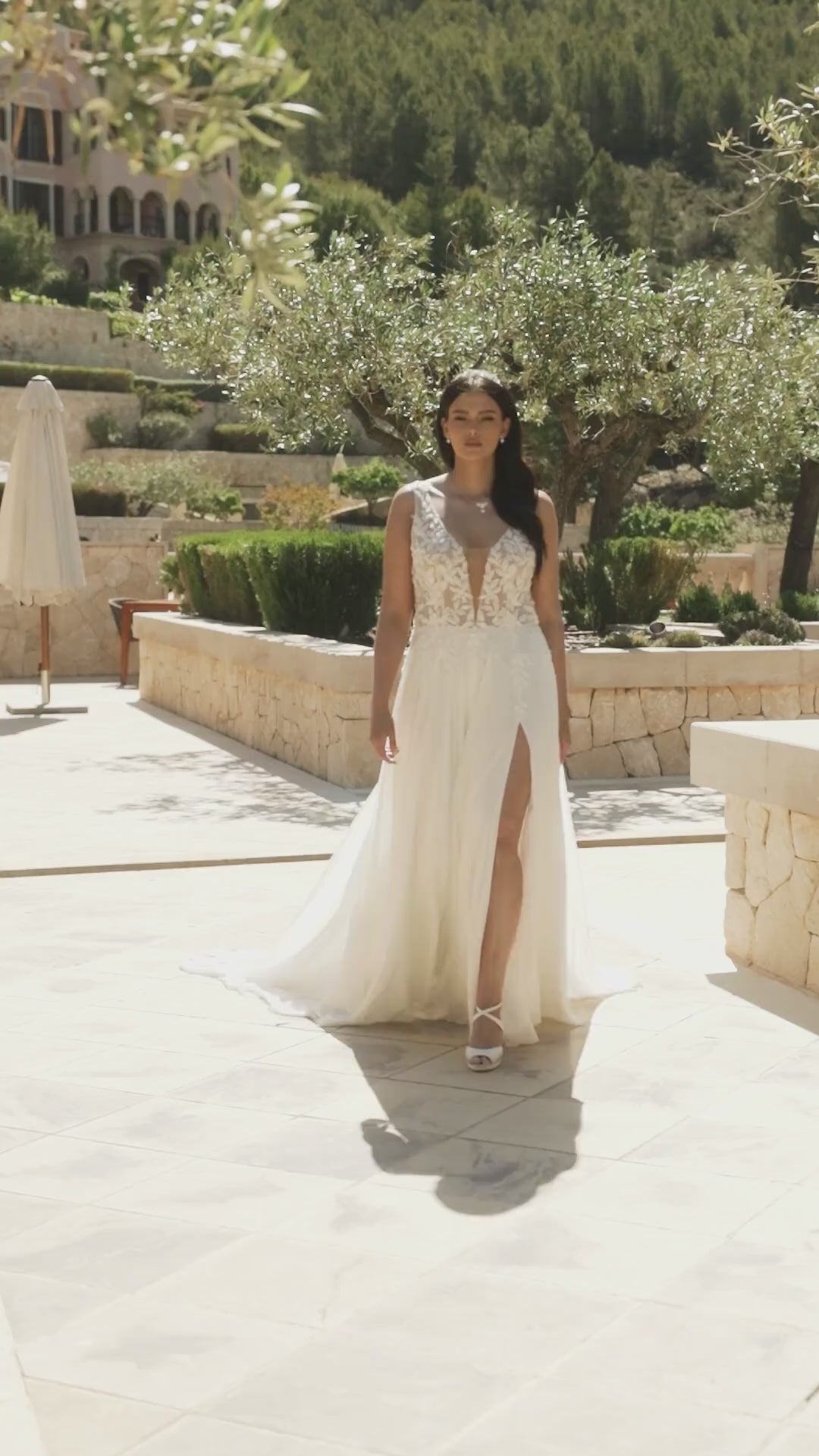 MILON is an exquisite A-line bridal gown crafted from high-quality chiffon and lace. This sexy gown features a long train and comes with a V-neckline with a V-back. It has a natural waistline that enhances the silhouette and is adorned with modern lace embroidery. This sleeveless gown epitomizes elegance and sophistication.